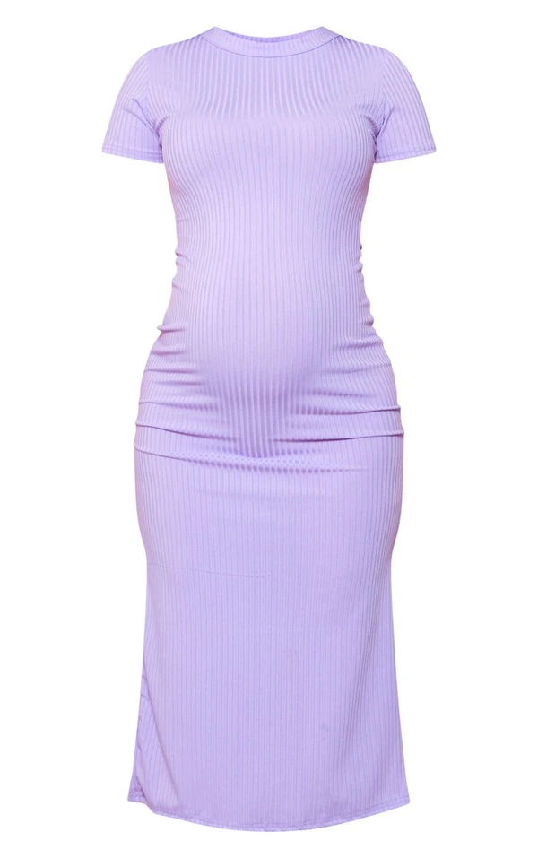 Maternité Robe de grossesse mi-longue en maille côtelée lilas à manches courtes