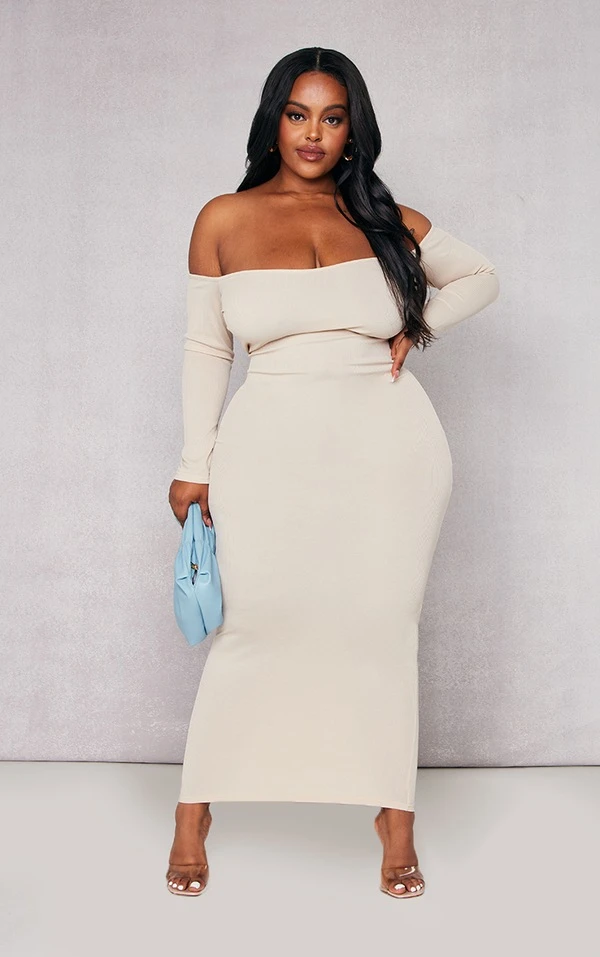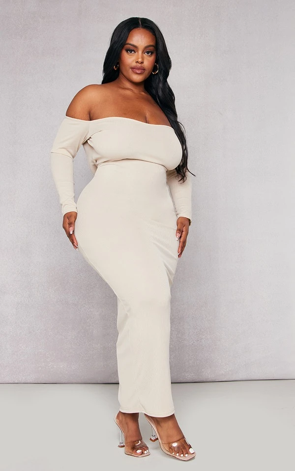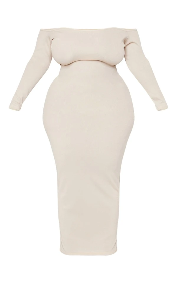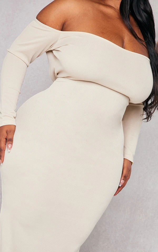 Plus Robe bustier mi-longue côtelée avoine à col bardot et manches longues