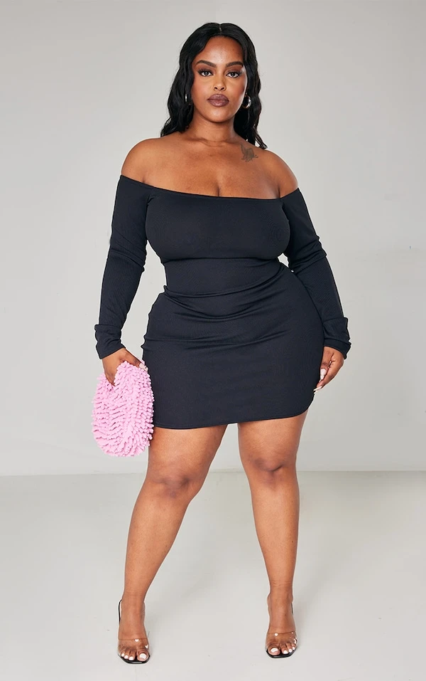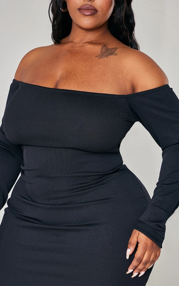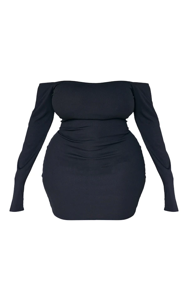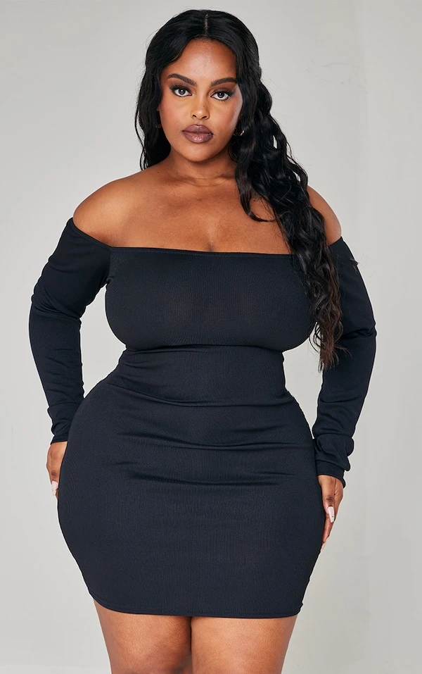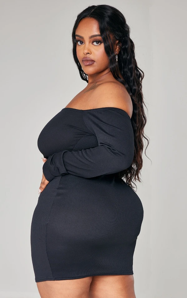 Plus Robe moulante noire côtelée à col bardot et manches longues