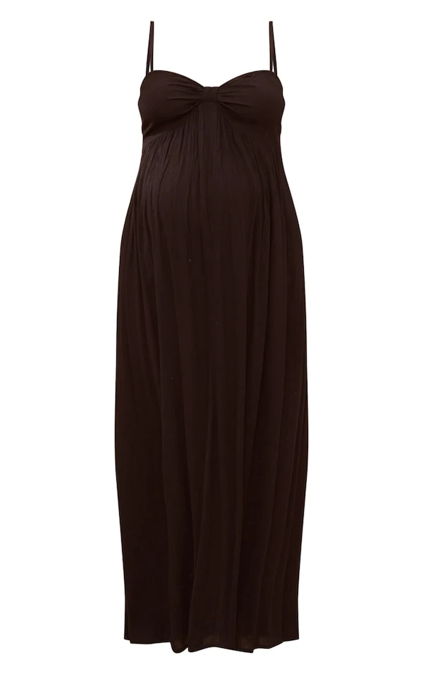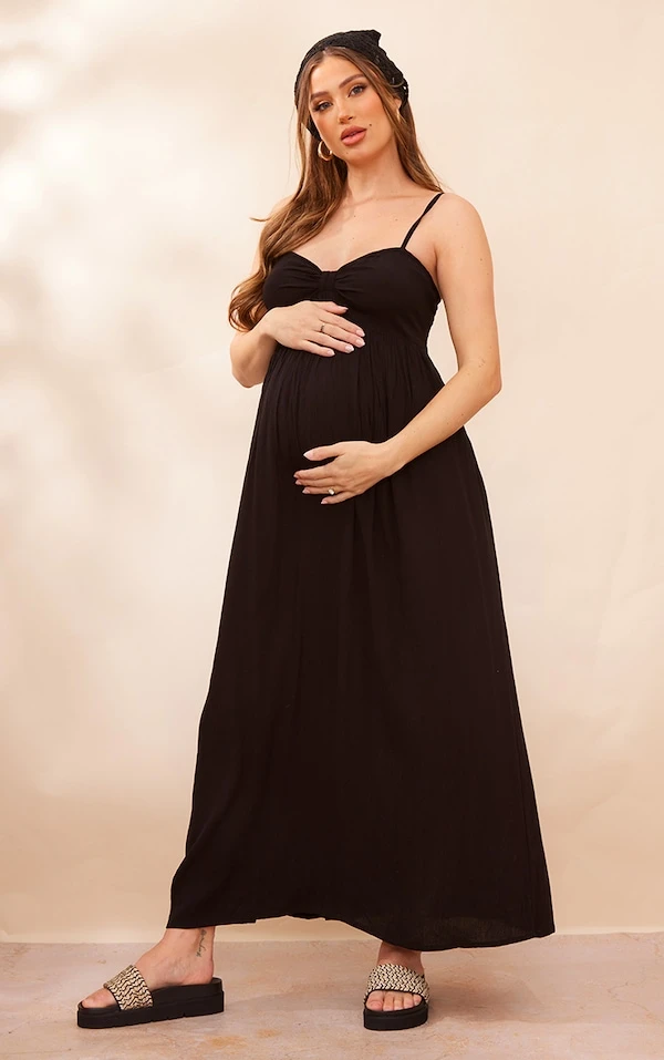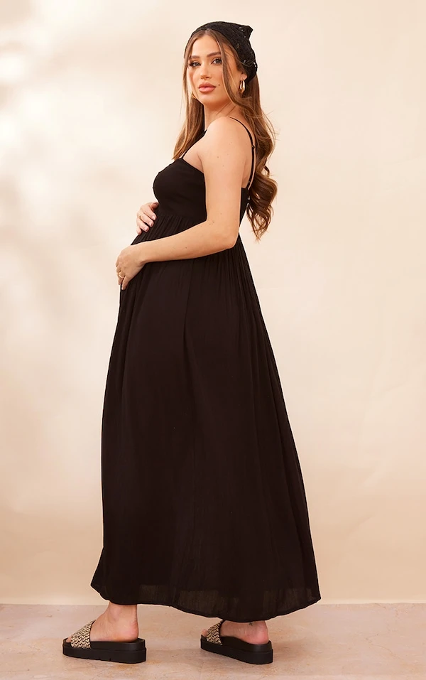 Maternité Robe de grossesse longue noire en étamine à bretelles et détail bonnets