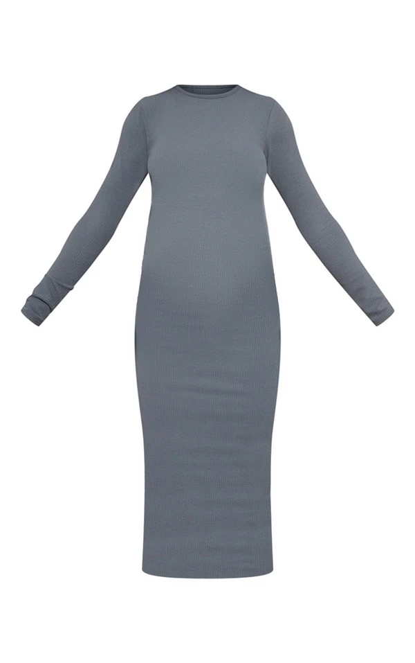Maternité Robe de grossesse mi-longue côtelée gris anthracite à manches longues