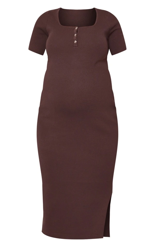Maternité Robe de grossesse mi-longue en maille douce chocolat boutonnée