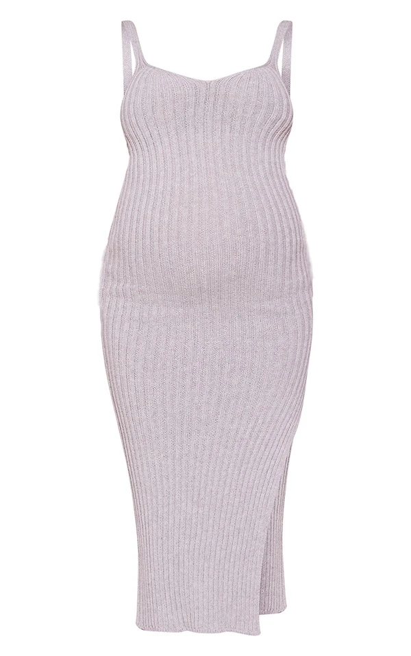 Maternité Robe de grossesse mi-longue en maille tricot grise côtelée