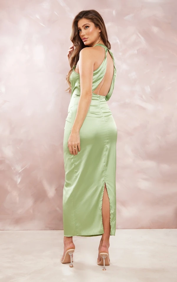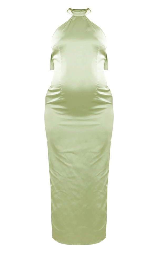 Maternité Robe longue de grossesse satinée sauge à col montant