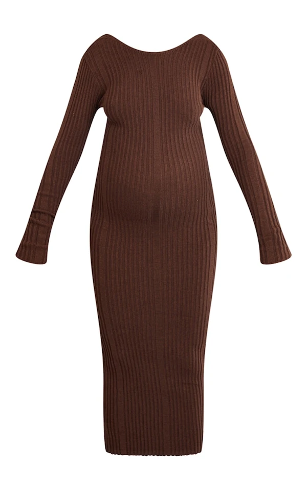 Maternité Robe moulante de grossesse longue en maille tricot chocolat à nouer derrière