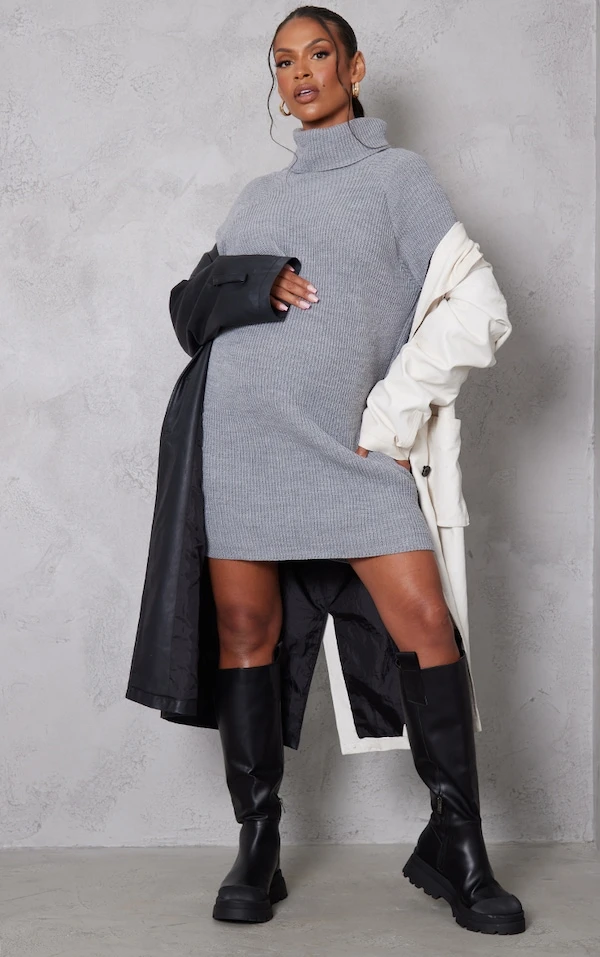 Notre crush de la saison, la robe pull ! Celle-ci vous garde vous et bébé bien au chaud tout en étant stylée avec sa coupe oversize, sa couleur gris chiné et son col montant. Portée avec une paire de bottes hautes, vous êtes la future maman la plus stylée du quartier !