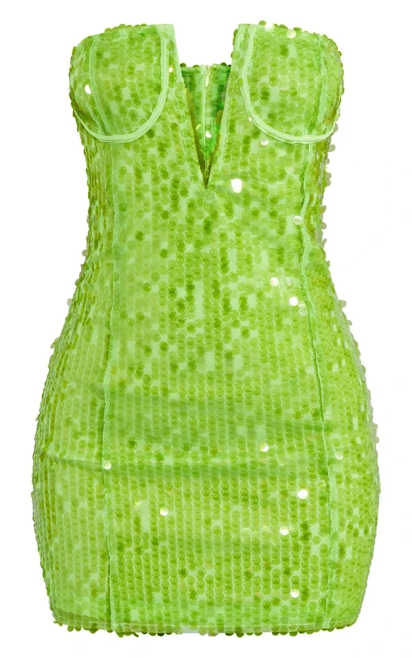 Petite Mini robe corset moulante vert citron fluo à sequins