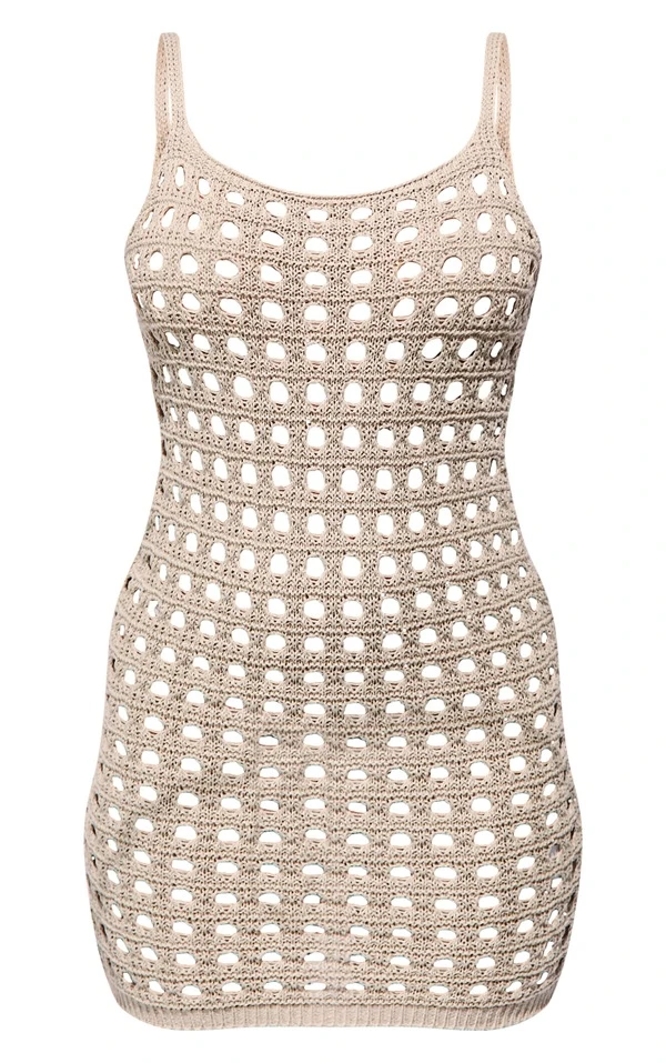 Petite Mini-robe en maille crochet gris pierre à bretelles