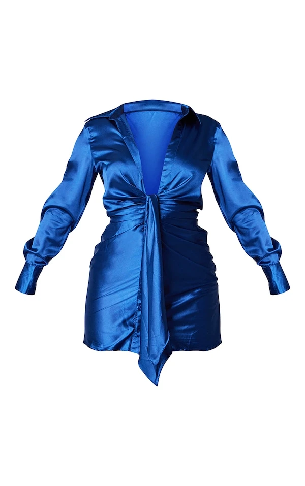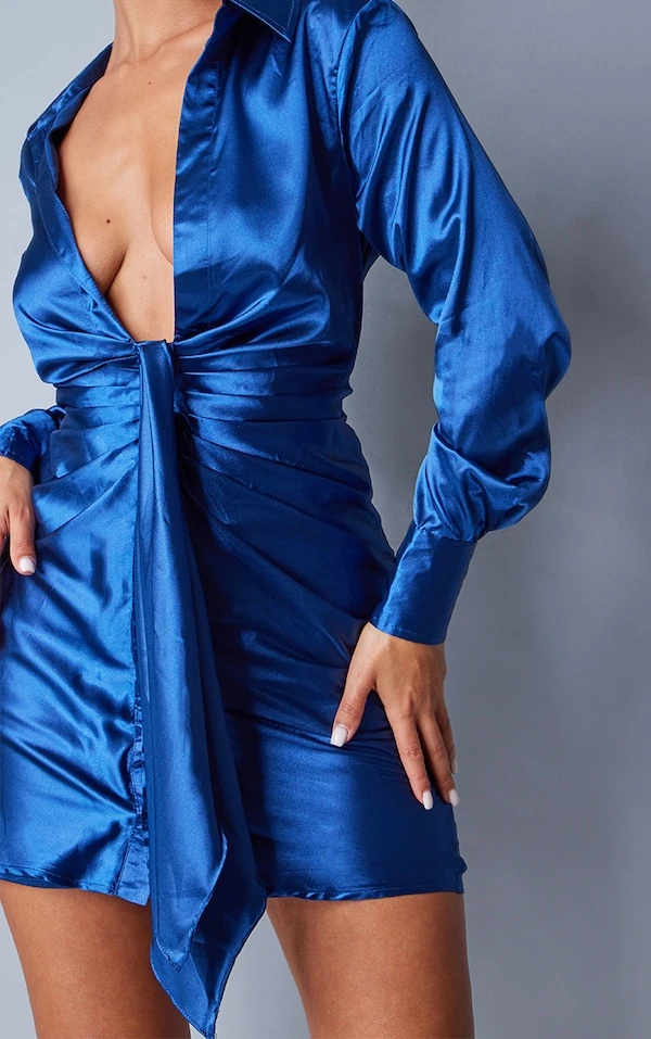 Canon la mini robe ! Avec sa matière satinée, son bleu marine et son lien noué devant, elle nous a fait craquer. Il ne manque qu’une paire de talons et go !