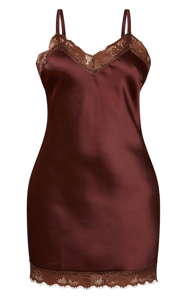 Petite Robe à fines bretelles satinée chocolat à bordures en dentelle