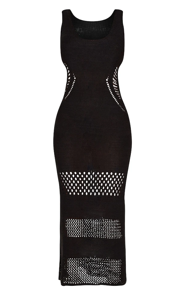 Petite Robe longue noire en maille crochet à décolleté plongeant