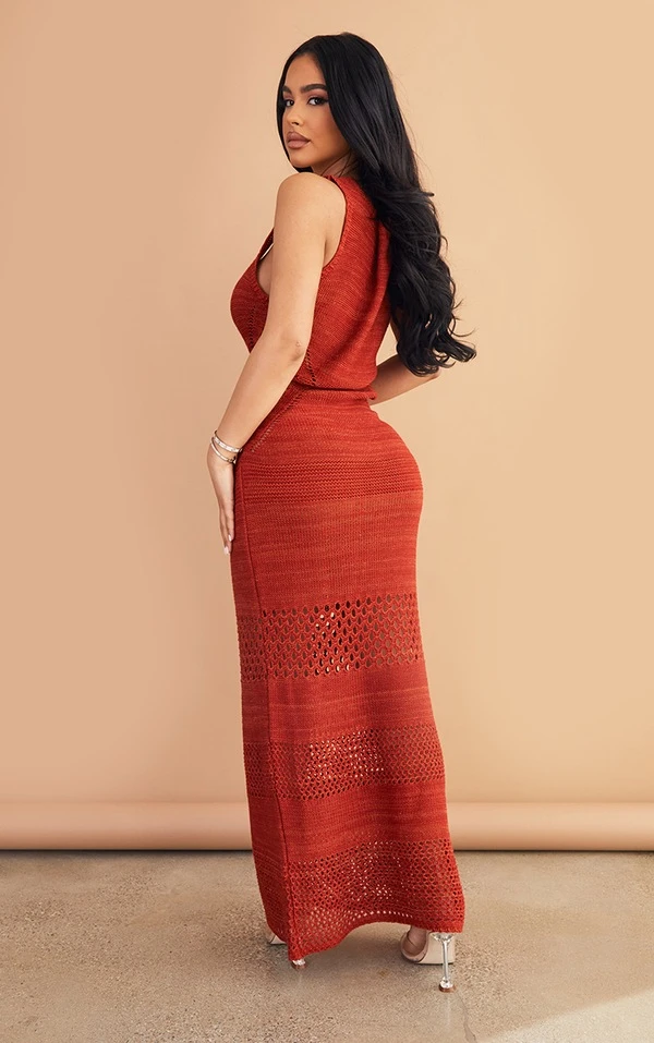 Petite Robe longue rouille en maille crochet à décolleté plongeant