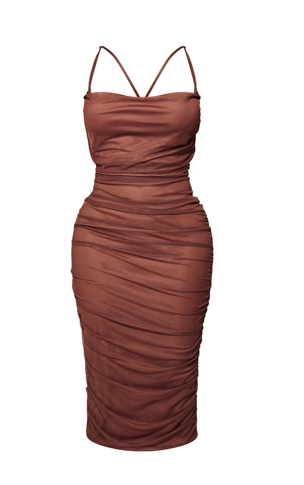 Petite Robe mi-longue froncée chocolat à bretelles et col bénitier