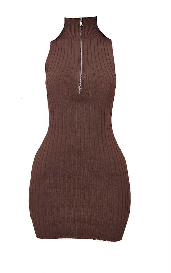 Petite Robe moulante en maille tricot chocolat à demi-zip