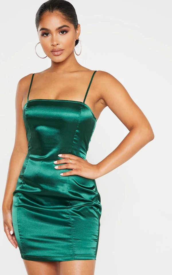 Petite Robe moulante satinée vert émeraude à col droit et fines bretelles