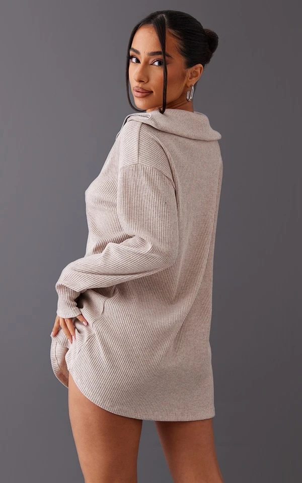 Petite Robe pull oversize côtelée avoine à col montant et demi-zip