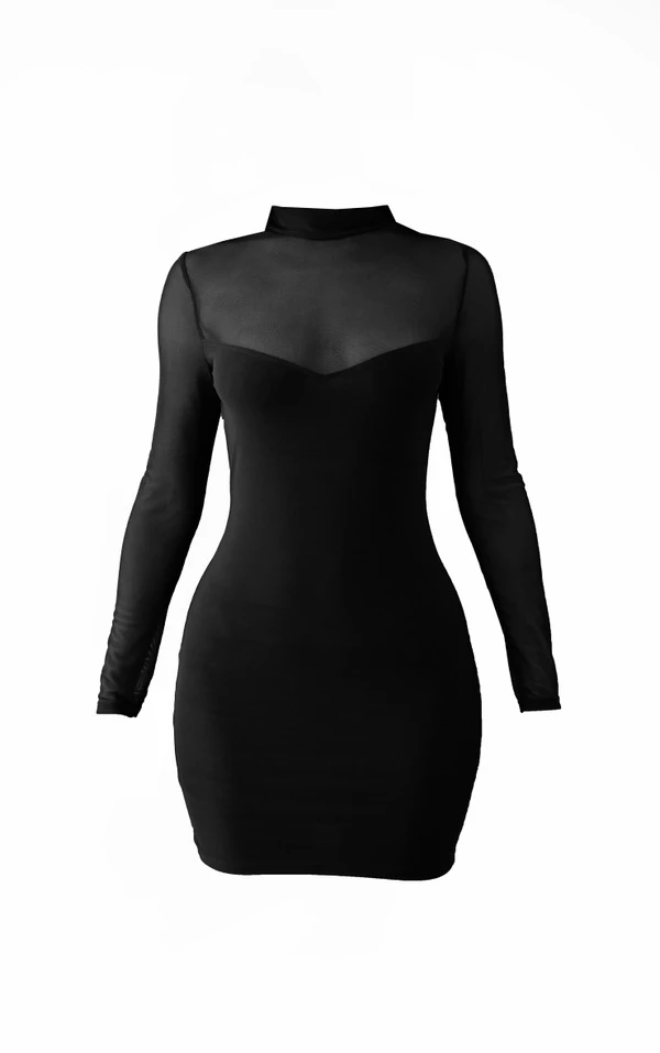 Petite Robe très moulante noire à parties contrastantes en mesh et manches longues