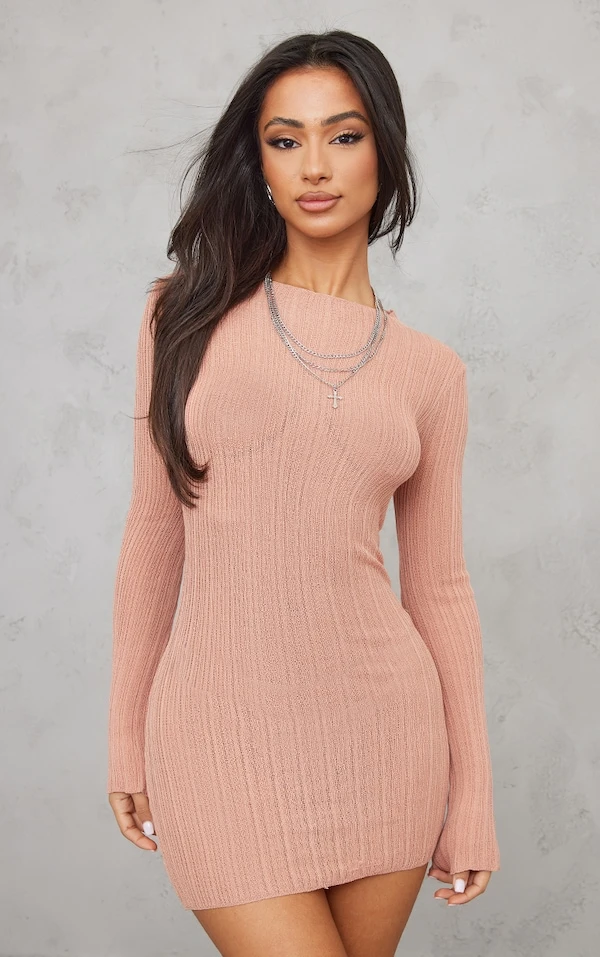 Divine dans cette robe ! On est hyper fans de sa couleur vison, sa matière en maille tricot transparente très hot et son col montant. En soirée, elle se porte avec des bijoux argentés et des cuissardes noires. Sensationnelle, vous !