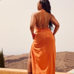Plus Robe De Plage Longue Fendue Orange Décolletée à Détail Tressé