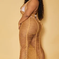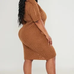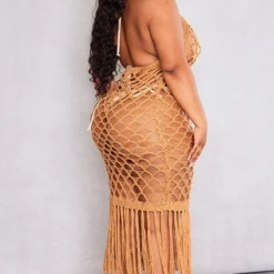 Plus Robe De Plage En Maille Tricot Camel Détail Franges à Dos Nu