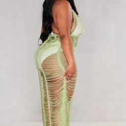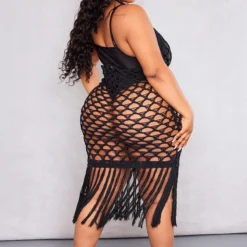 Plus Robe De Plage En Maille Tricot Noire Détail Franges à Dos Nu