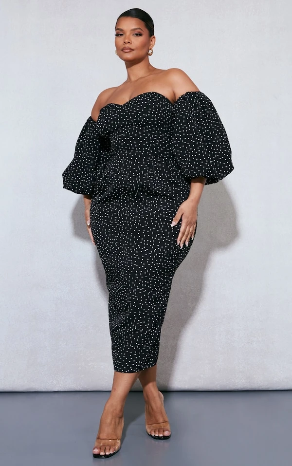 Plus Robe bustier mi-longue noire à pois et manches bouffantes