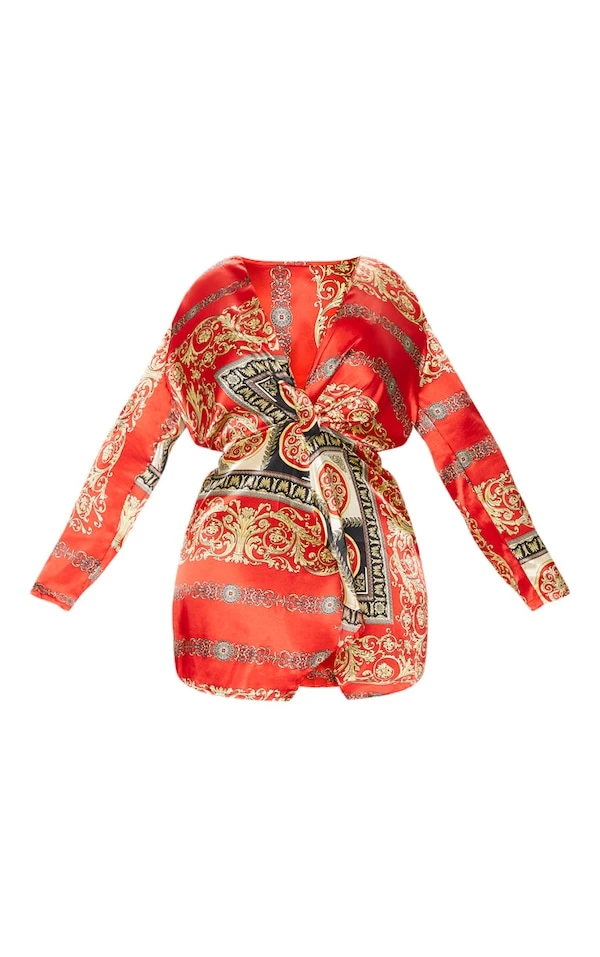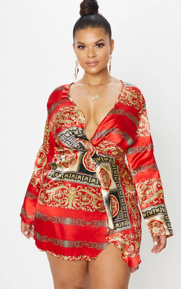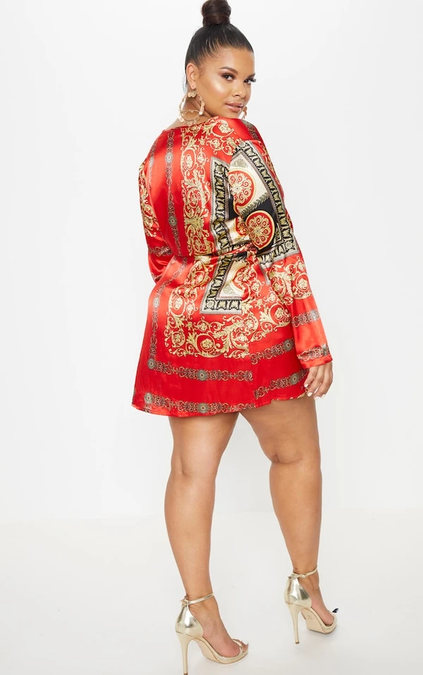 Plus – Robe cache-coeur rouge à imprimé satinée à manches longues torsadée