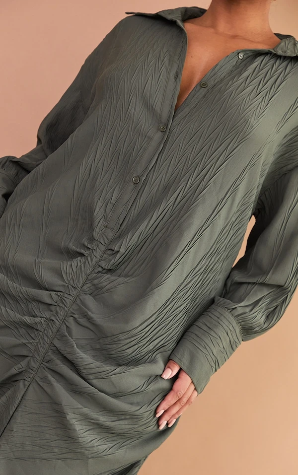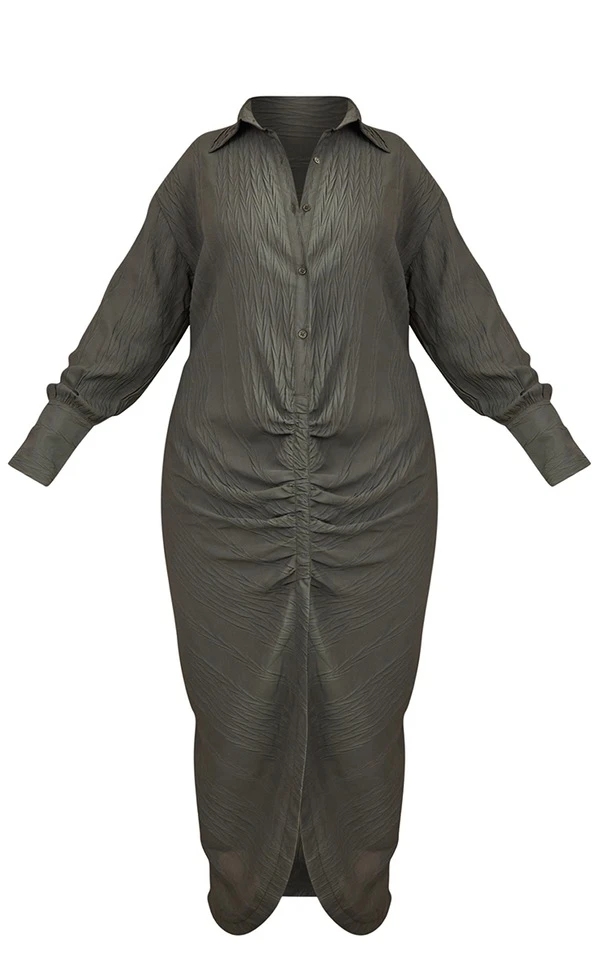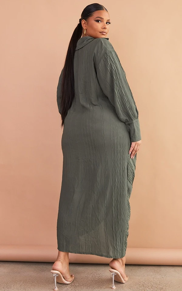 Plus Robe chemise mi-longue vert olive texturée à fronces et manches longues