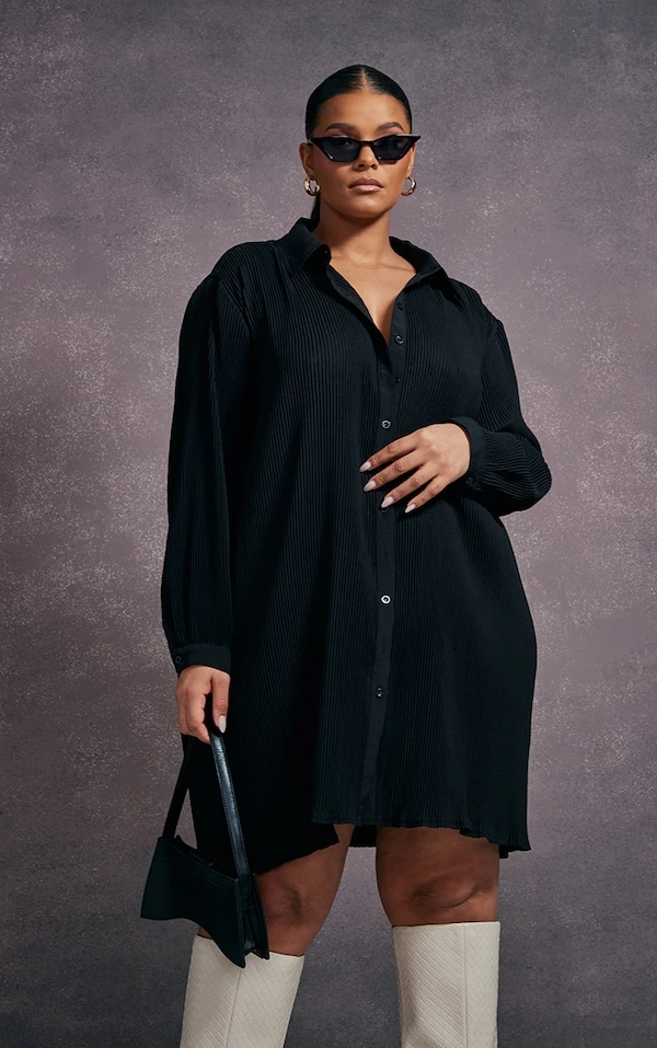 Pratique et très stylée cette robe au style chemise ! On adore sa matière plissée très flatteuse, son coloris noir qui va avec tout et sa coupe oversize magnifique et cosy. Plus qu’à enfiler des talons lacés et quelques accessoires shiny. Vous êtes super belle.