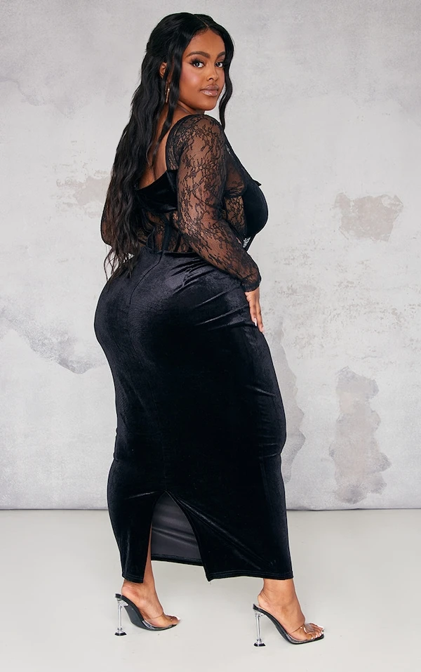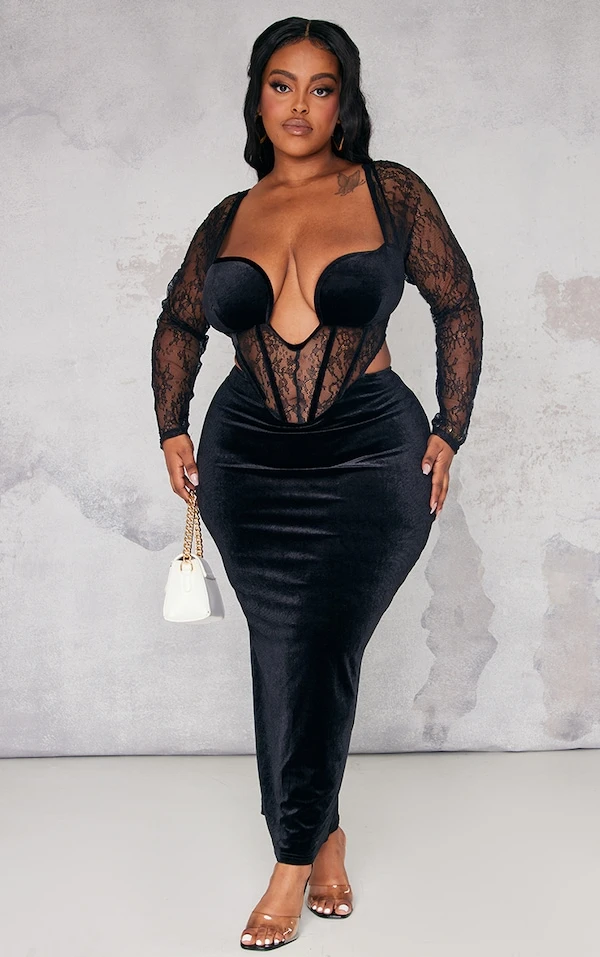 Plus Robe corset mi-longue noire en velours à parties en dentelle