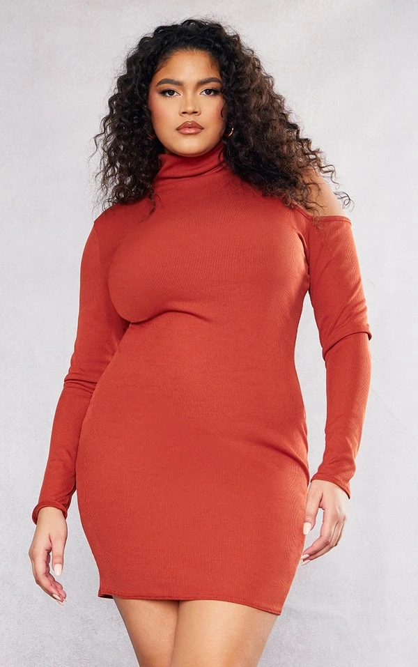 Plus Robe côtelée argile manches longues à col montant et découpes