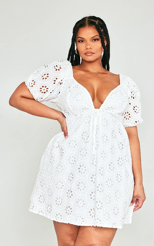 Plus Robe droite blanche en broderie anglaise à manches bouffantes