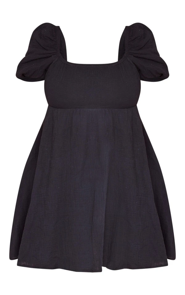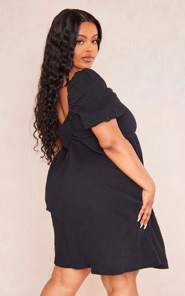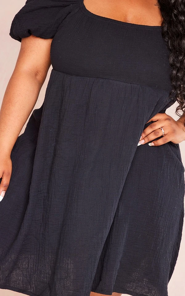 Plus Robe droite en effet lin texturé noir à manches bouffantes