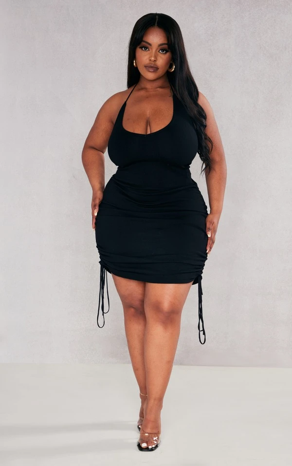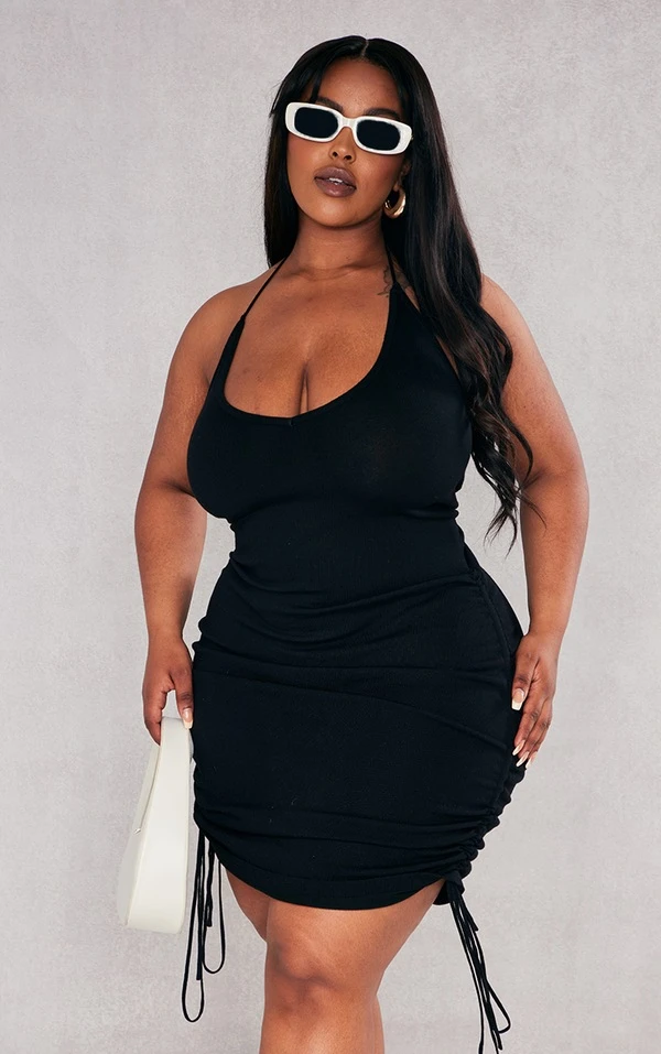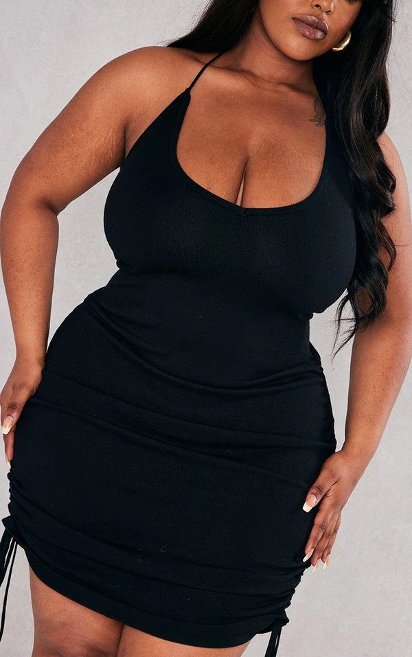Plus Robe en maille tricot noire froncée à col V et bretelles