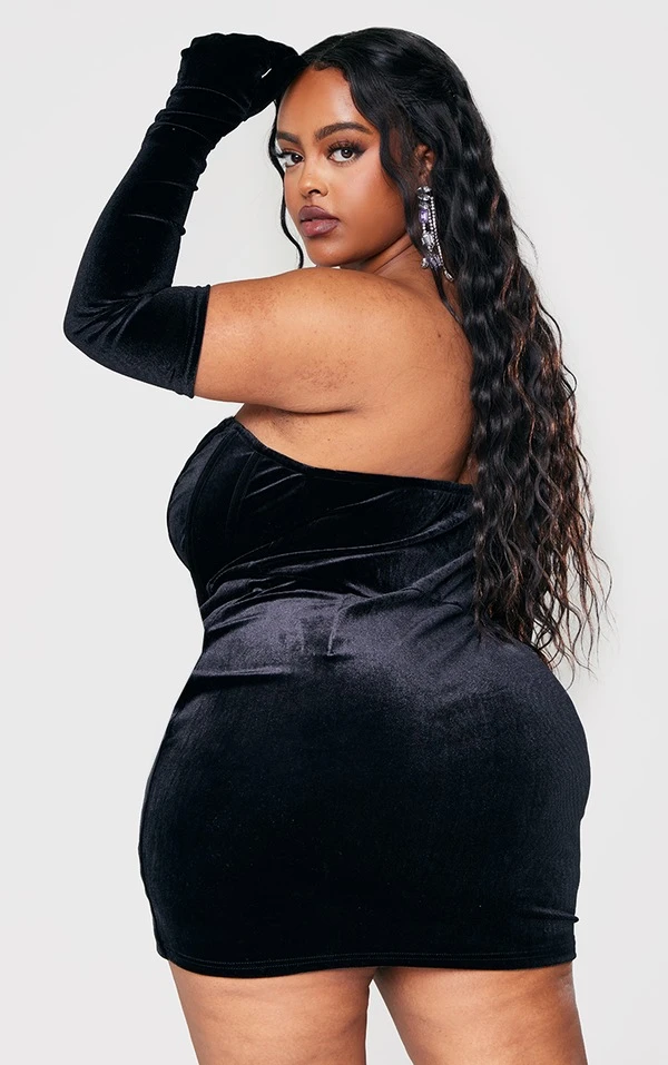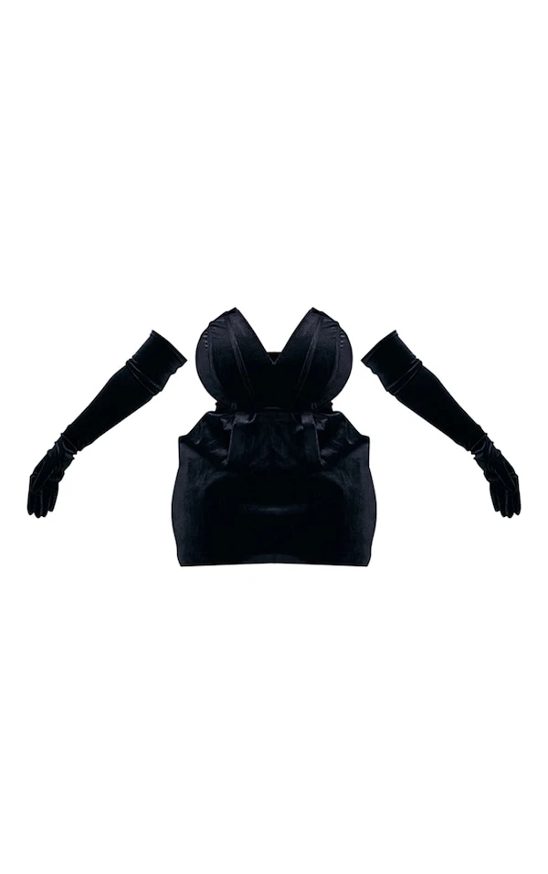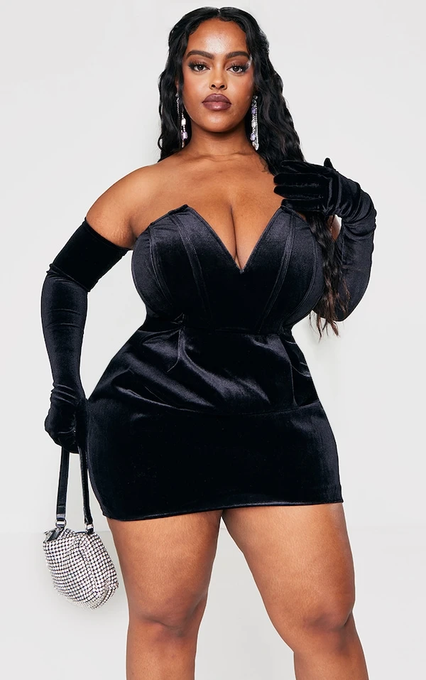 Glam et hot dans cette robe bustier ! Avec son décolleté à barre en V structurant, son velours noir et ses gants assortis, elle est parfaite pour vos soirées de l’automne-hiver. Une paire de mules et des bijoux dorés finalisent ce look bombesque en un instant !