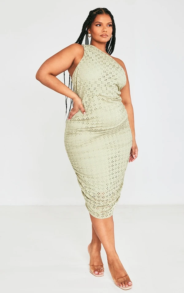 Plus Robe froncée mi-longue vert sauge à broderie anglaise