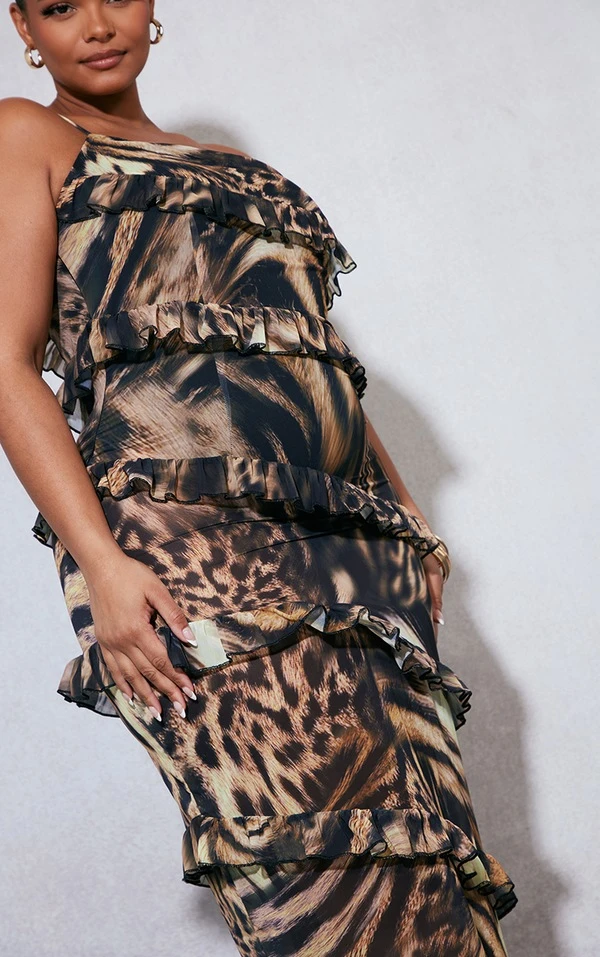 Plus Robe longue asymétrique marron imprimée léopard à volants