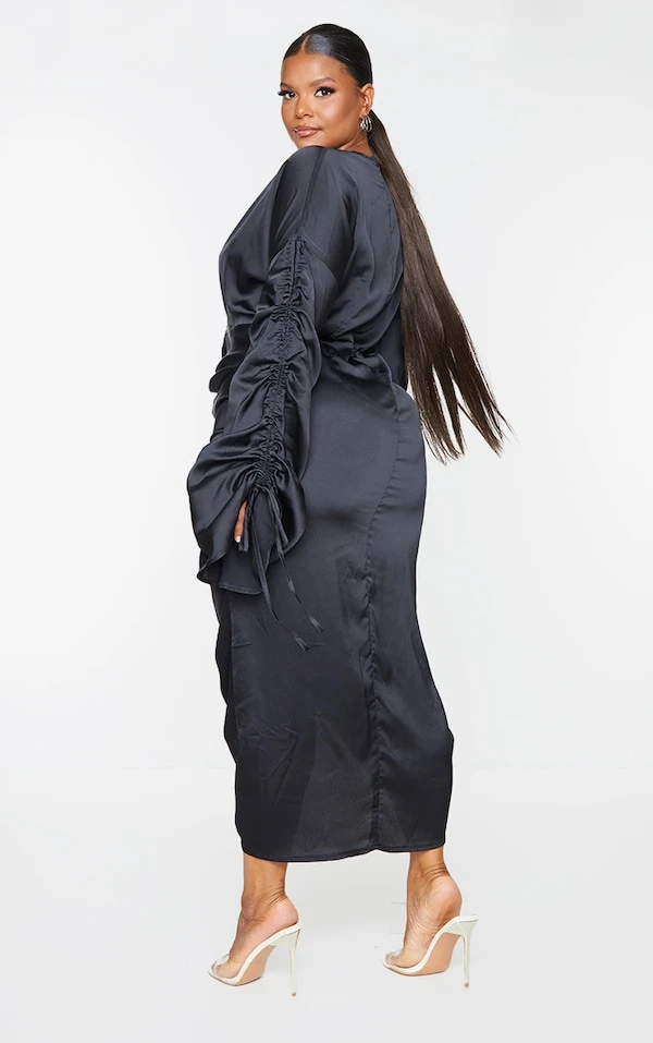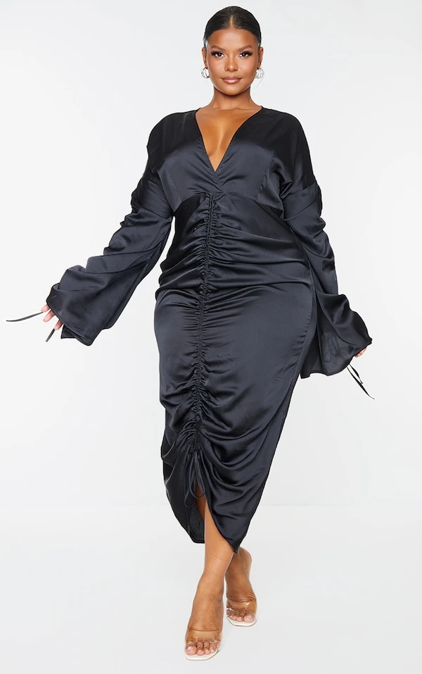 Plus Robe longue moulante décolletée satinée froncée noire