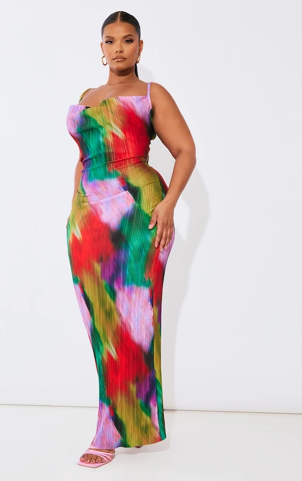 Plus Robe longue plissée imprimé multicolore à col bénitier