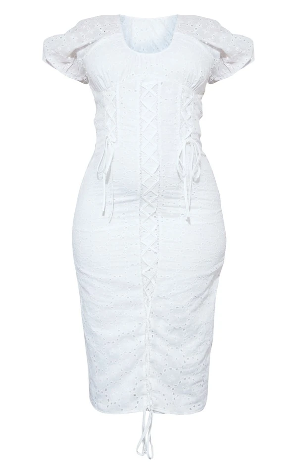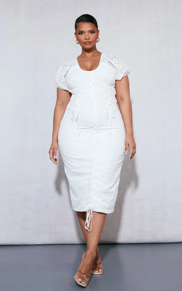 Plus Robe mi-longue blanche à broderie anglaise et lacets