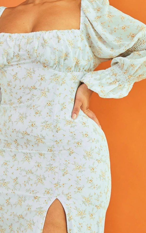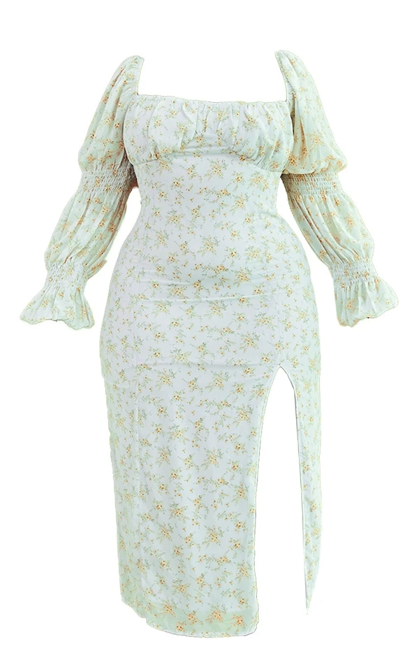 Plus Robe mi-longue bleu cendré fleurie à manches bouffantes