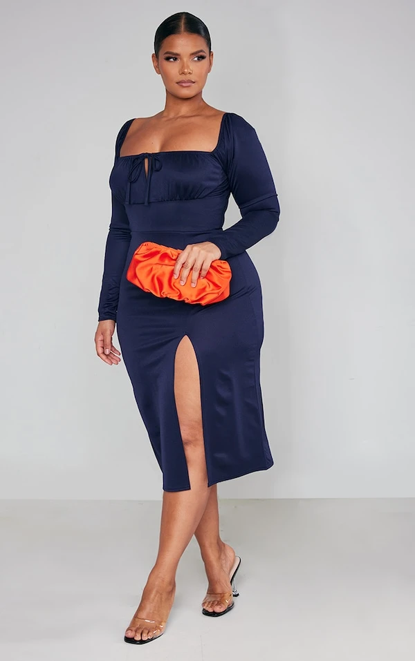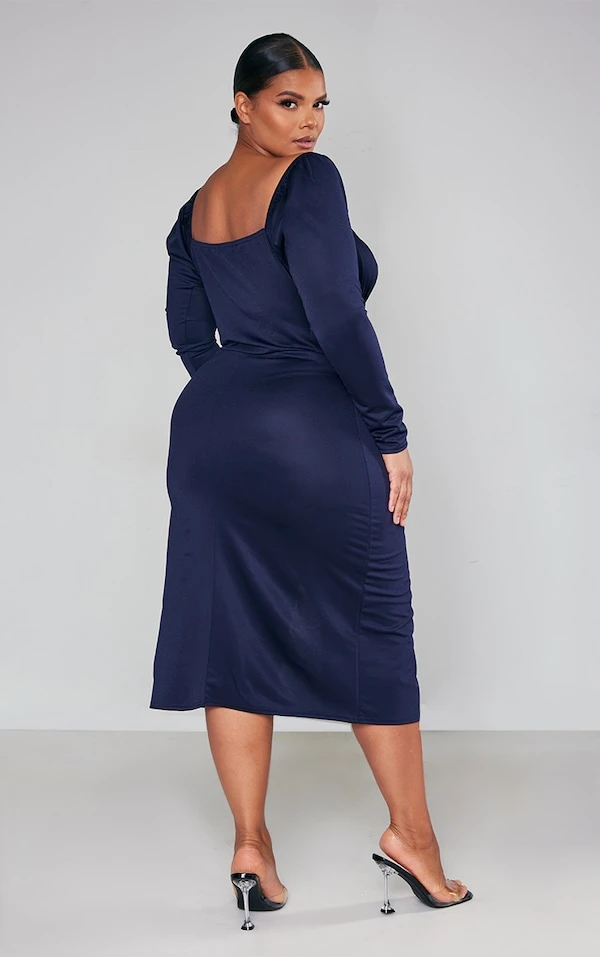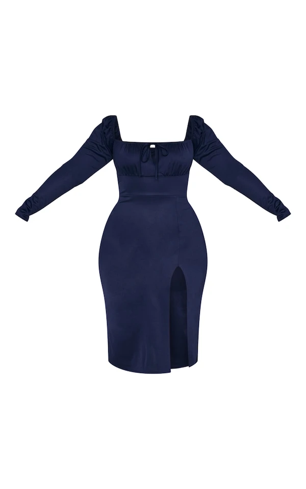 Plus Robe mi-longue bleu marine nouée devant à manches bouffantes