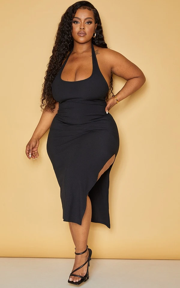 Plus Robe mi-longue côtelée noire à dos nu