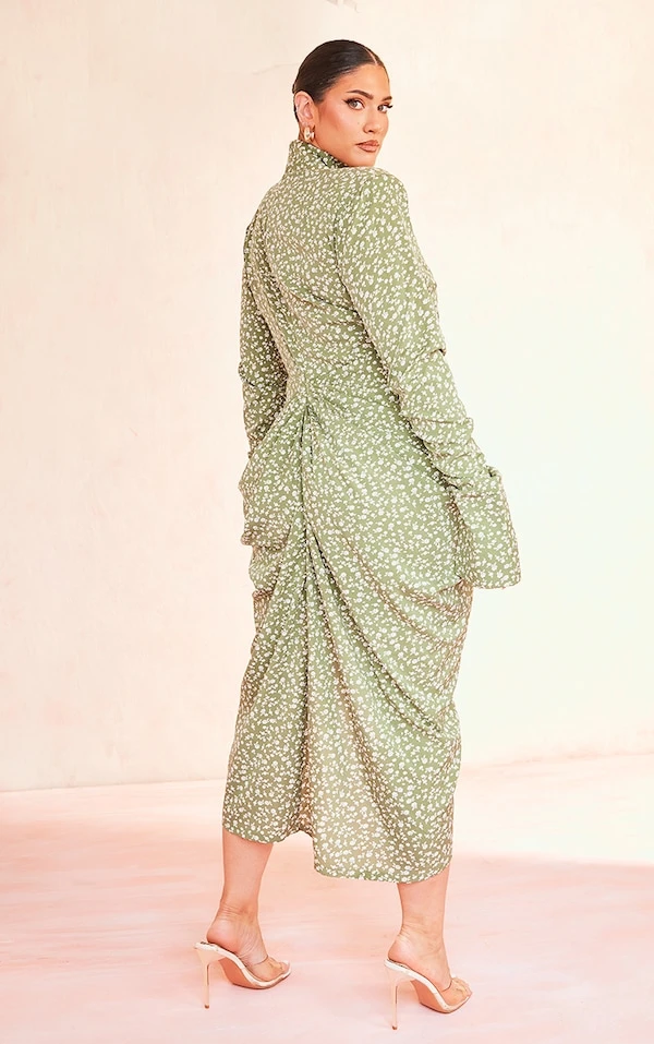 Plus Robe mi-longue drapée verte fleurie à col montant