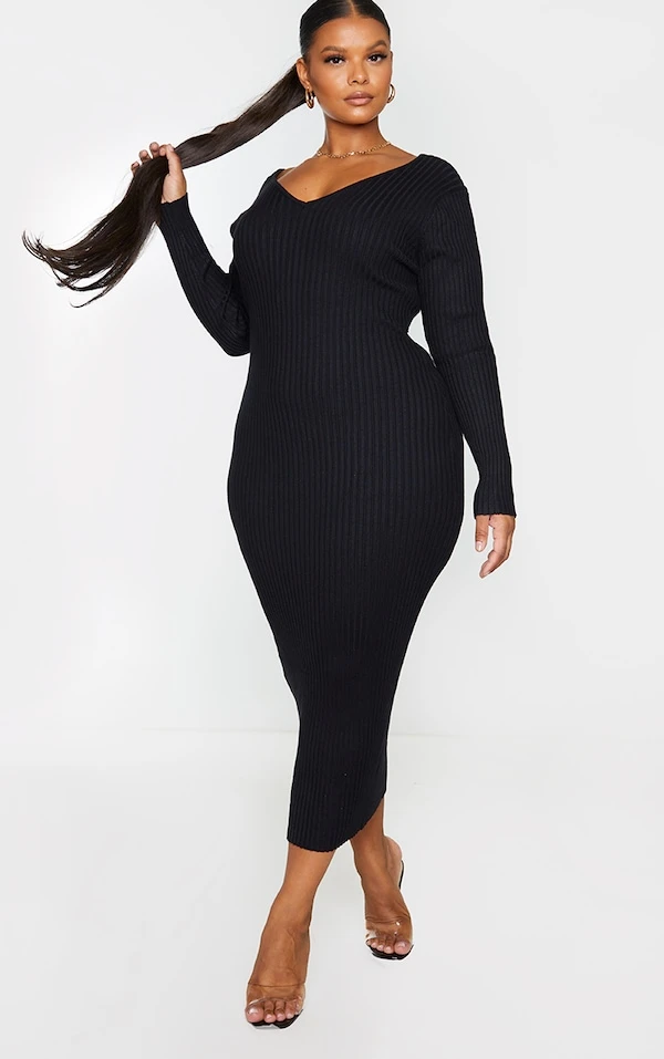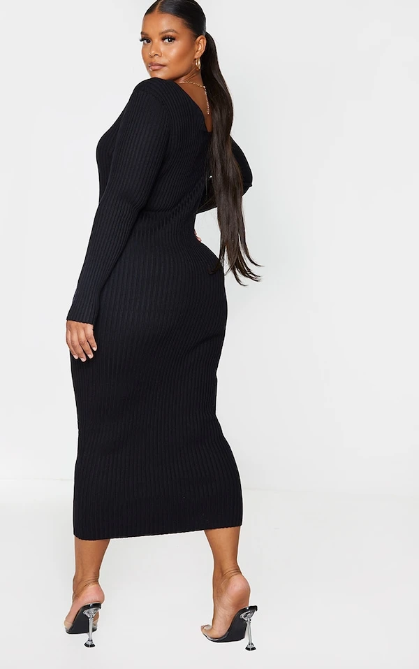 Plus Robe mi-longue en maille côtelée noire à épaules dénudées