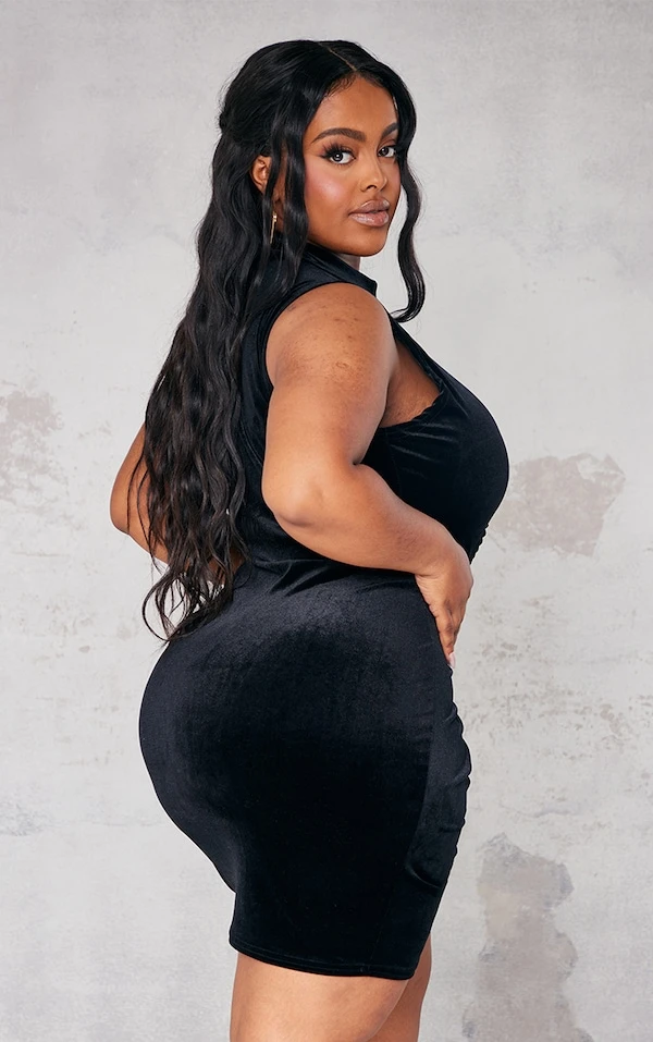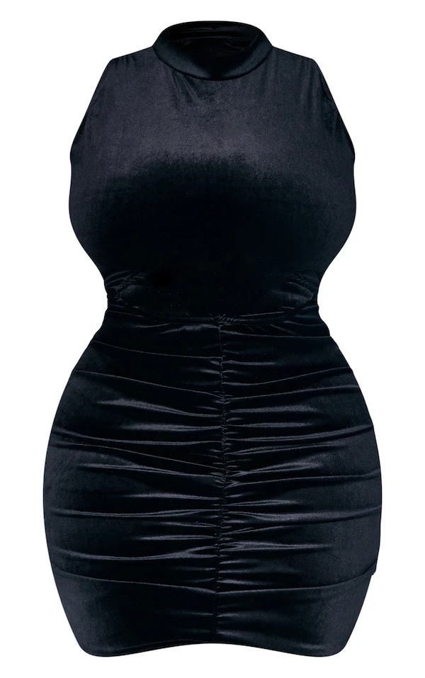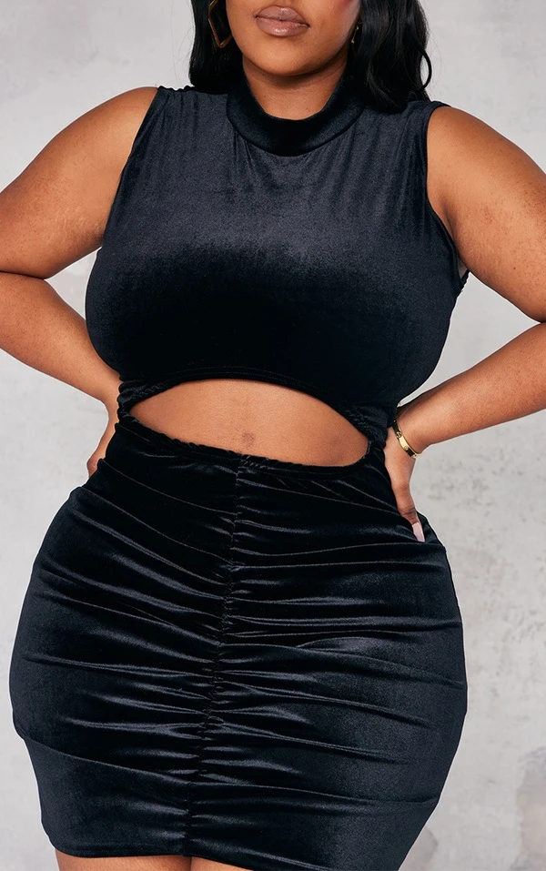 Plus Robe mi-longue noire en velours à découpes et devant froncé
