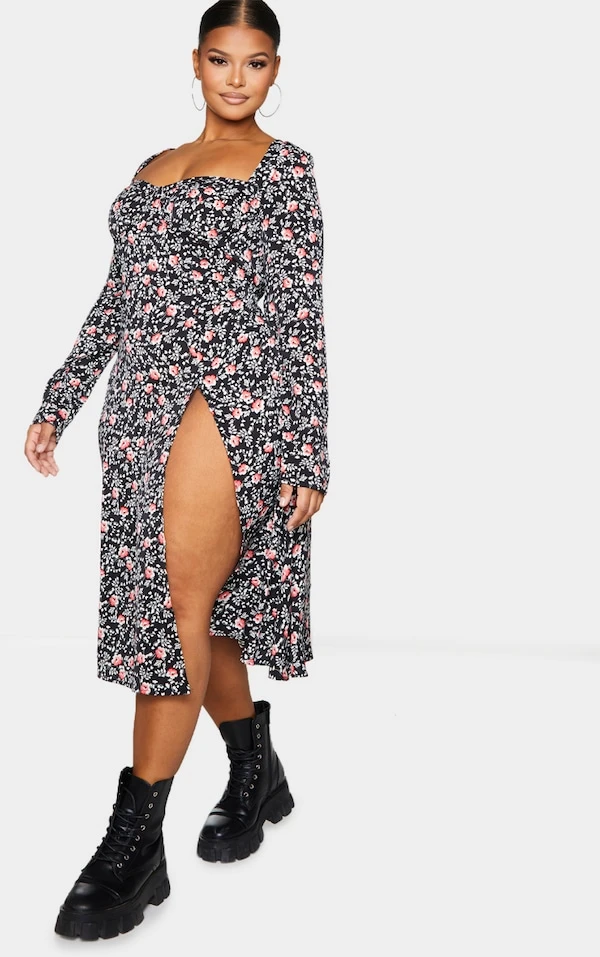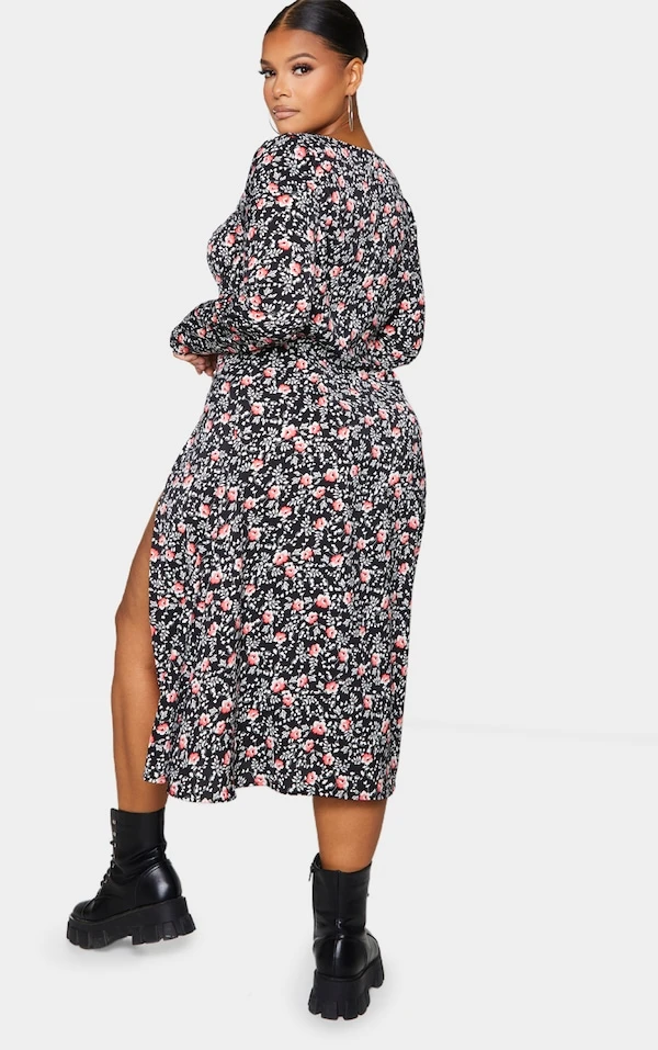 Plus Robe mi-longue noire imprimé fleuri à bonnets et fente