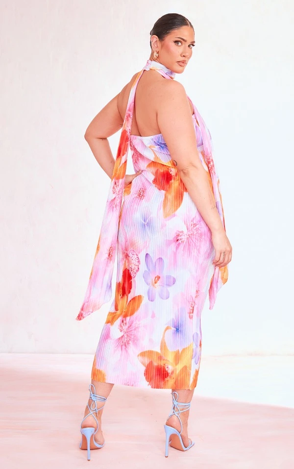 Plus Robe mi-longue plissée rose fleurie à col ras