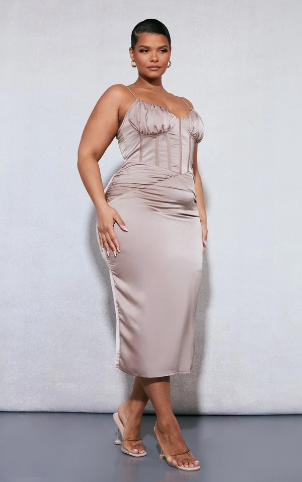 Plus Robe mi-longue satinée café au lait à buste froncé
