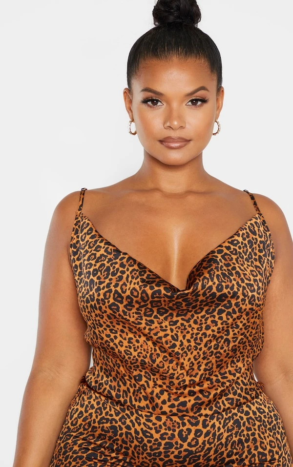 Plus Robe mi-longue satinée imprimé léopard à col bénitier et bretelles